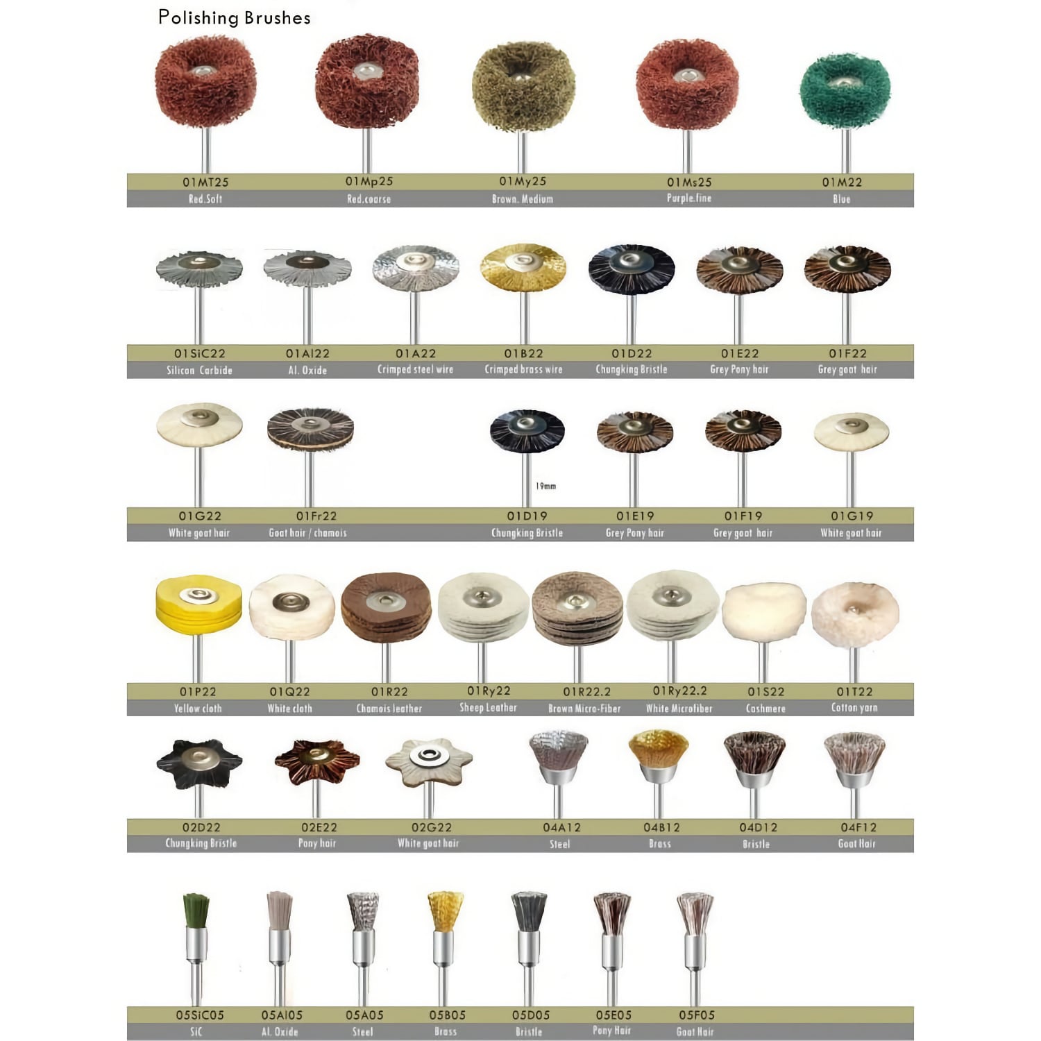 | POLISHING-BRUSHE-FELT-BOB-BURMANDRELS | POLISHING-BRUSHE-FELT-BOB-BURMANDRELS | 2.35 | 50, 120, 190, 220, 250, | Crimped steel, Chungking Bristle, Grey goat hair, Silicon carbide, Al oxide, Red coarse, Brown Medium, No-woolen Web, Yellow cloth, White cloth, Chamois leather, Microfiber leather, Goat hair / chamois, Cashmere, Cotton Yarn, Pony hair, Crimped brass wire | Straight Handpiece | Wheel, Pen, Cup |