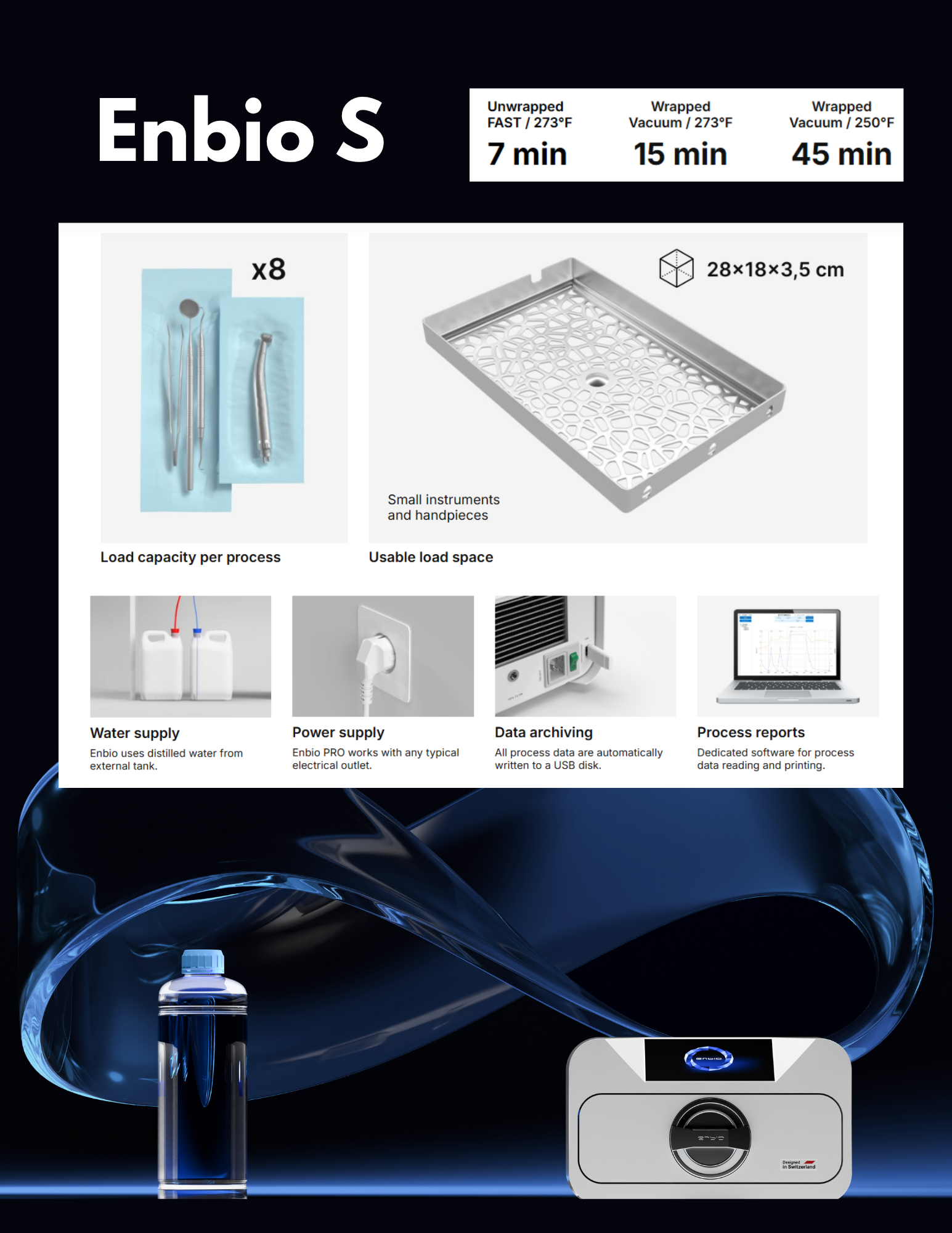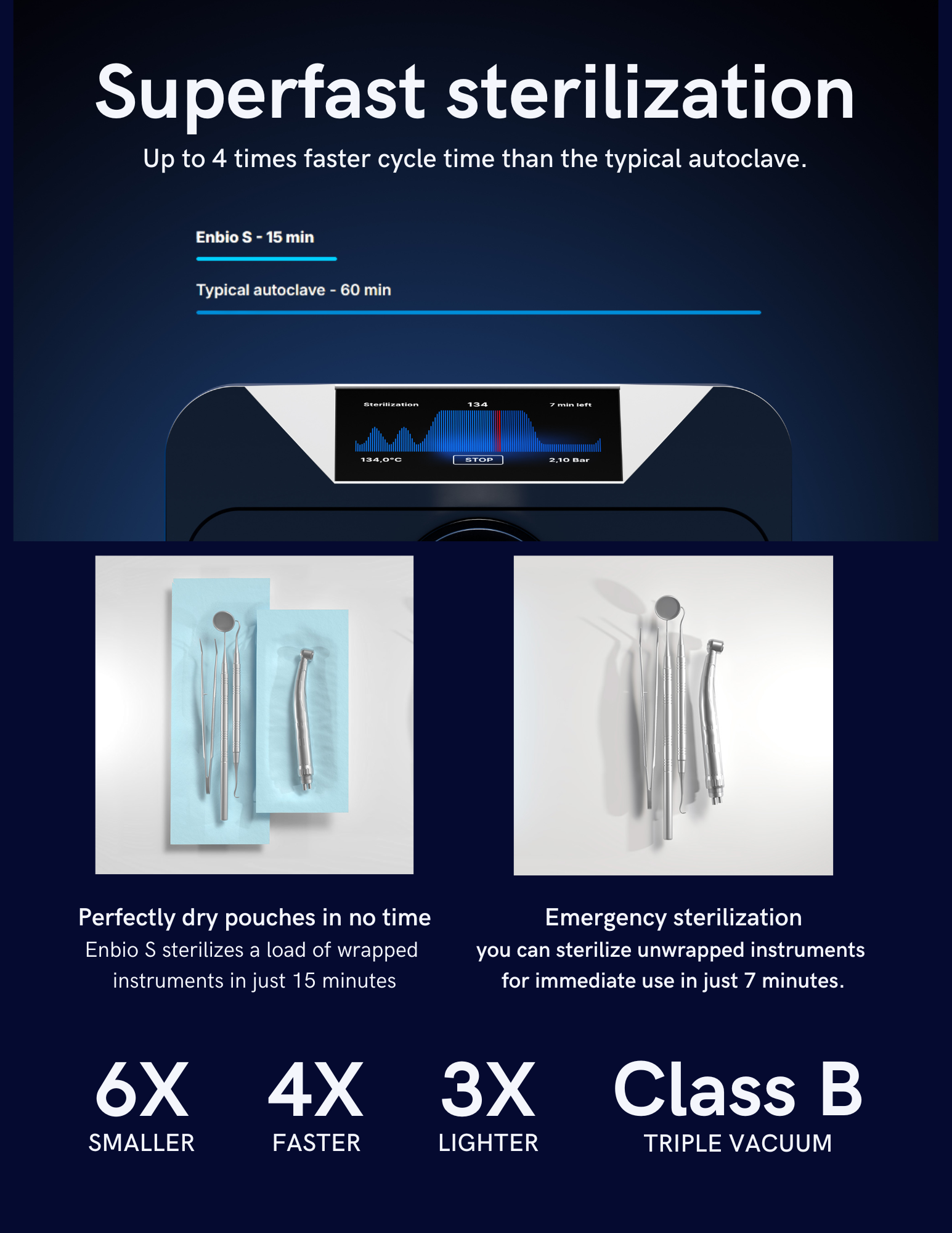 Enbio S sterilizes a load of wrapped instruments in just 15 minutes