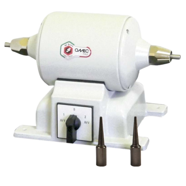 The polishing lathe is particularly strong and its driving-shaft turns on ball bearings. Its high power permits a very good finishing of the models. The unit has a safety switch and it is supplied with 1 right side threaded cone and 1 left side threaded cone. The motor frame also permits the self-ventilation. In such way a prolongued working with no overheating is possible.