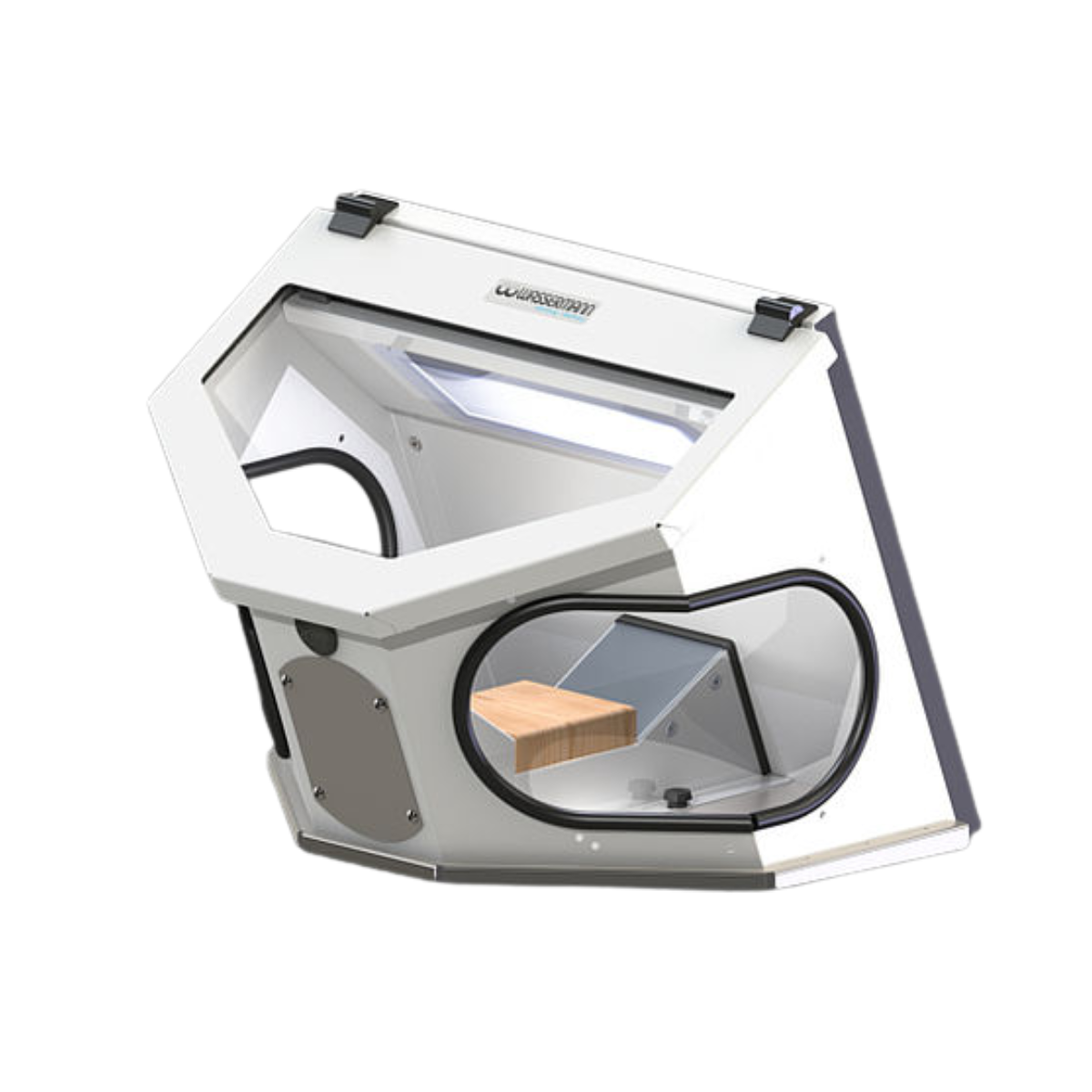 Perfect protection for first class results: The Suction Box Compact III offers a nearly dust-free operation, and thus meets modern requirements for workplace health and safety. Without the interference of dust, splinters or fumes, it allows the user to work efficiently and relaxed directly on the object. On request the openings for the hands can be additionally sealed with safety covers made of metal. A particular advantage are the two-sided, separate cuts for the handpiece and the sleeves with a lot of moving area and a high standard of hygiene.